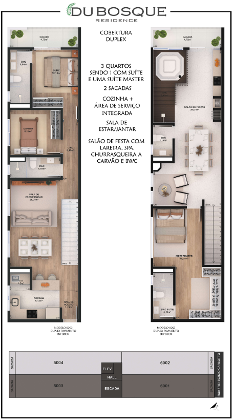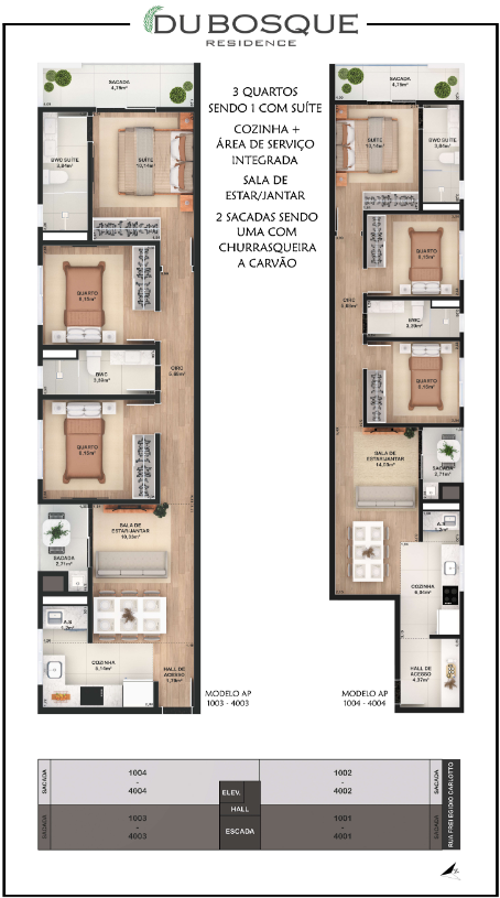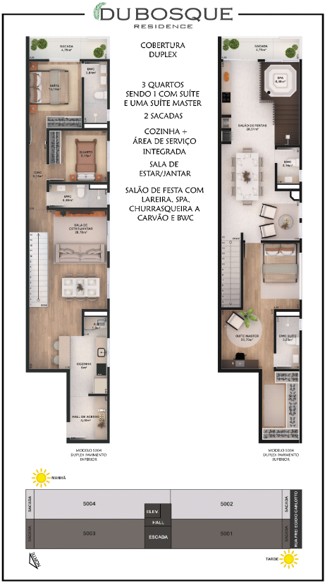 Coberturas duplex a partir de 153,26M² de área privativa, com 3 quartos sendo 2 suítes. Opções com sacada para face norte e sul